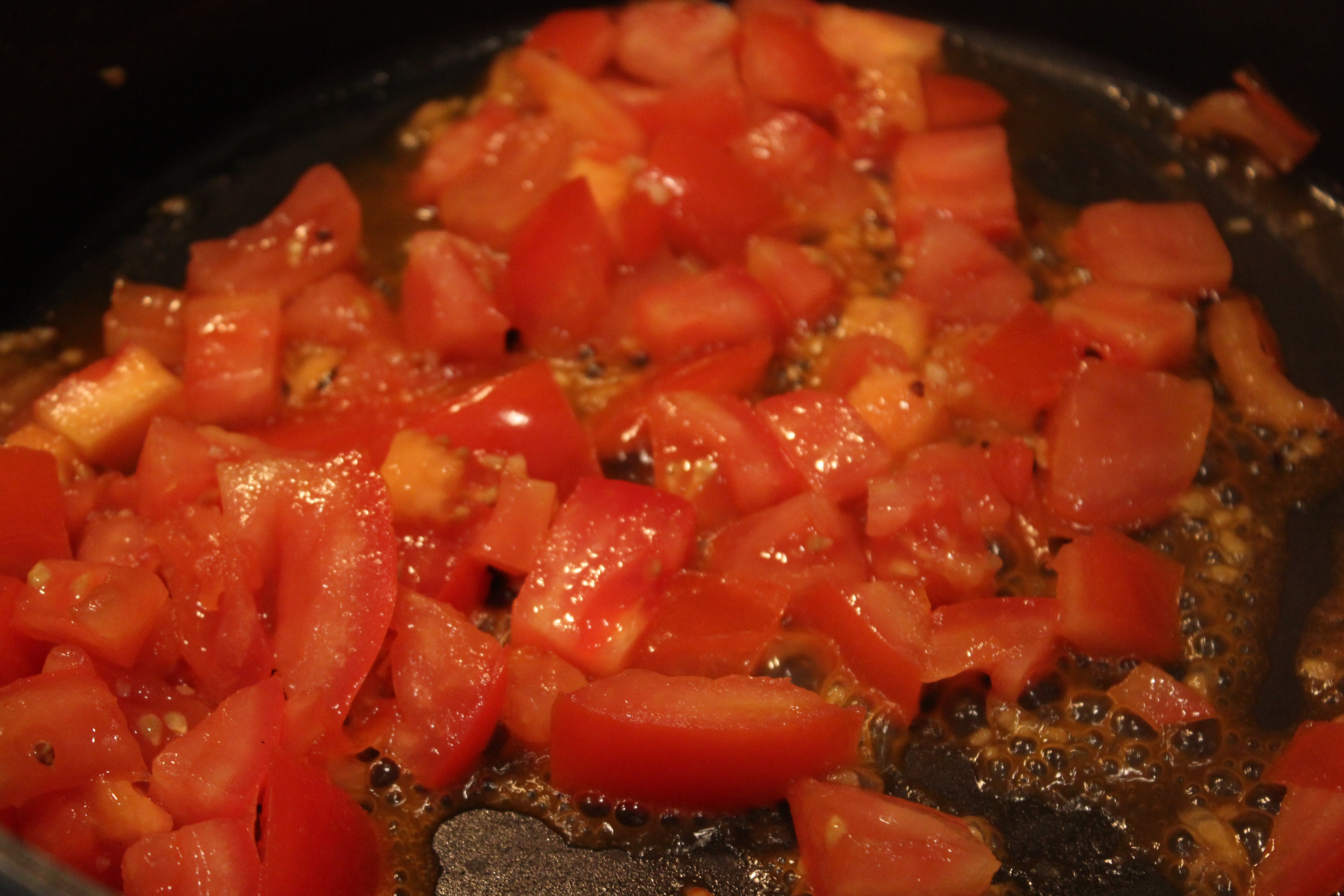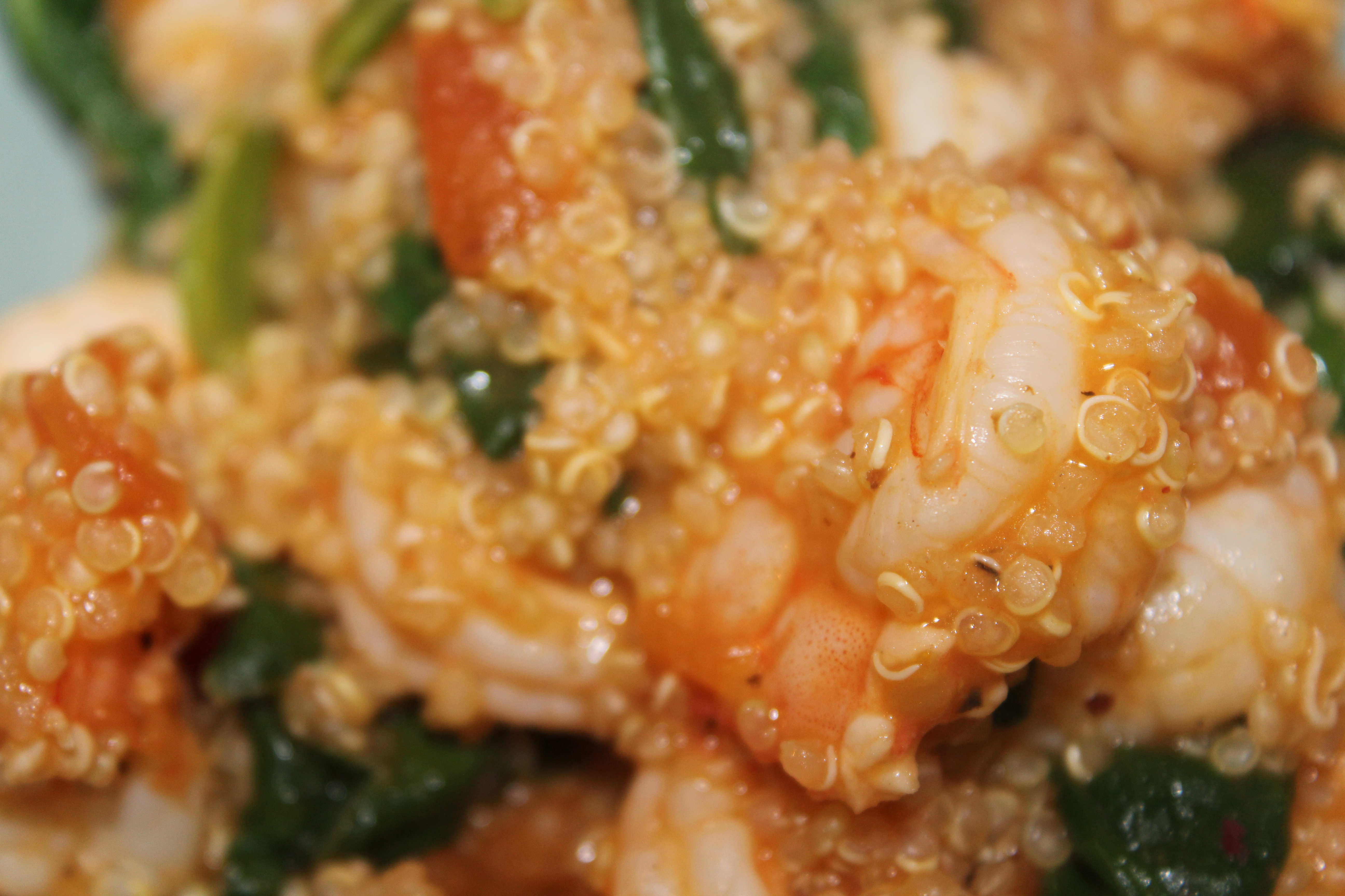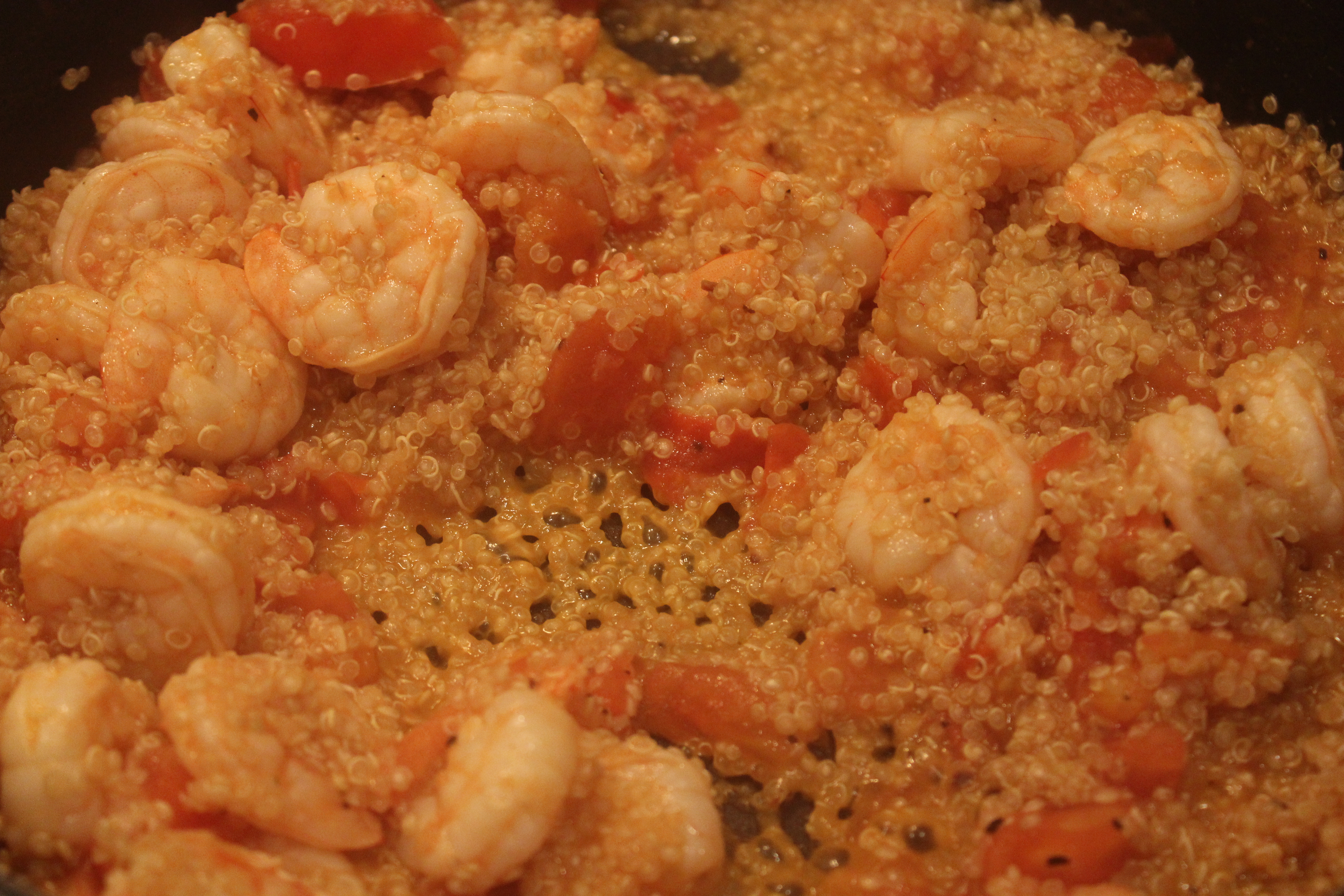 I got the quinoa going and then defrosted the shrimp and added fresh ground pepper and lemon juice, next i started on the “sauce” I diced up two tomatoes that were on the vine from the grocery store.  I started with a little extra virgin olive oil and minced garlic, then when that was hot i threw in the tomatoes and let them heat up.  When the tomatoes were done cooking I took them out and put them in a bowl then I cooked the shrimp and when they were done cooking in the left over juices I put the tomatoes back in and mixed them together.