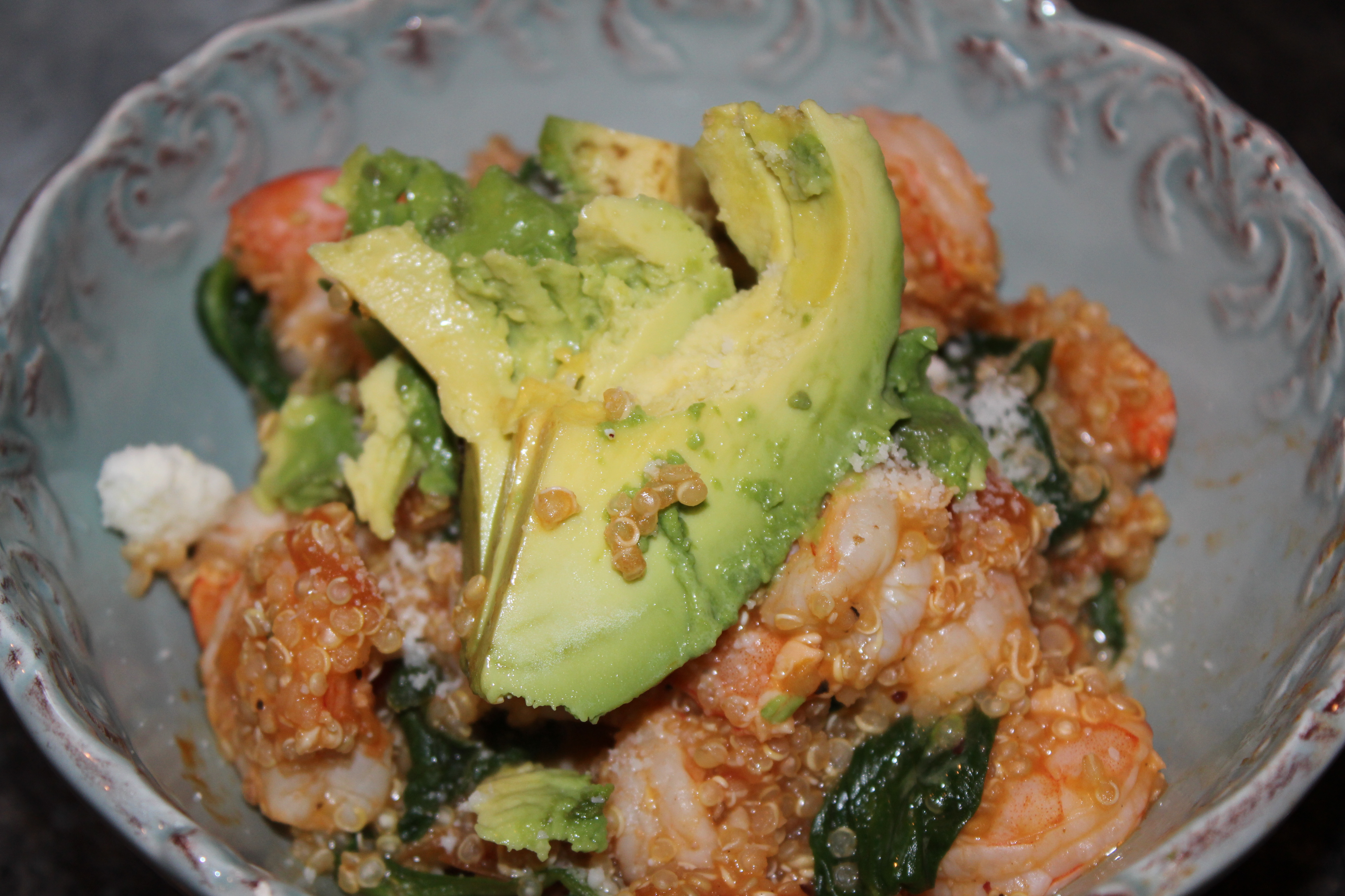 I then added in the quinoa which absorbed the lemon juice from the shrimp and the olive oil.  The last step after I took out my portion was just a little grated parm cheese and 1/4 of an avocado.  I don’t know what possessed me to put avocado on this meal but I’m glad I did because it was delic! It added a creaminess to the dish that I would have traditionally gotten from cheese, but this is a great healthy fix for those cheese addicts like me!