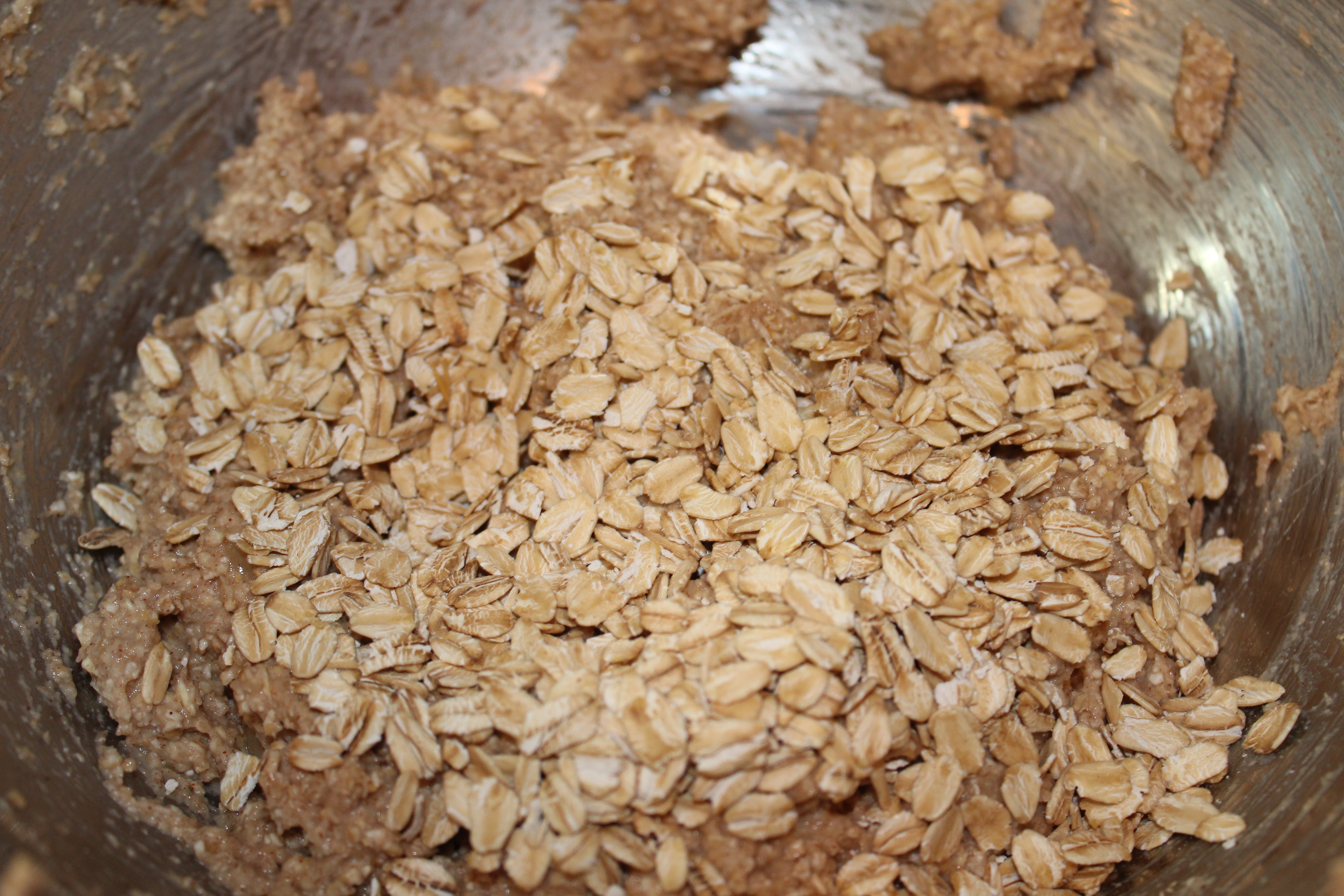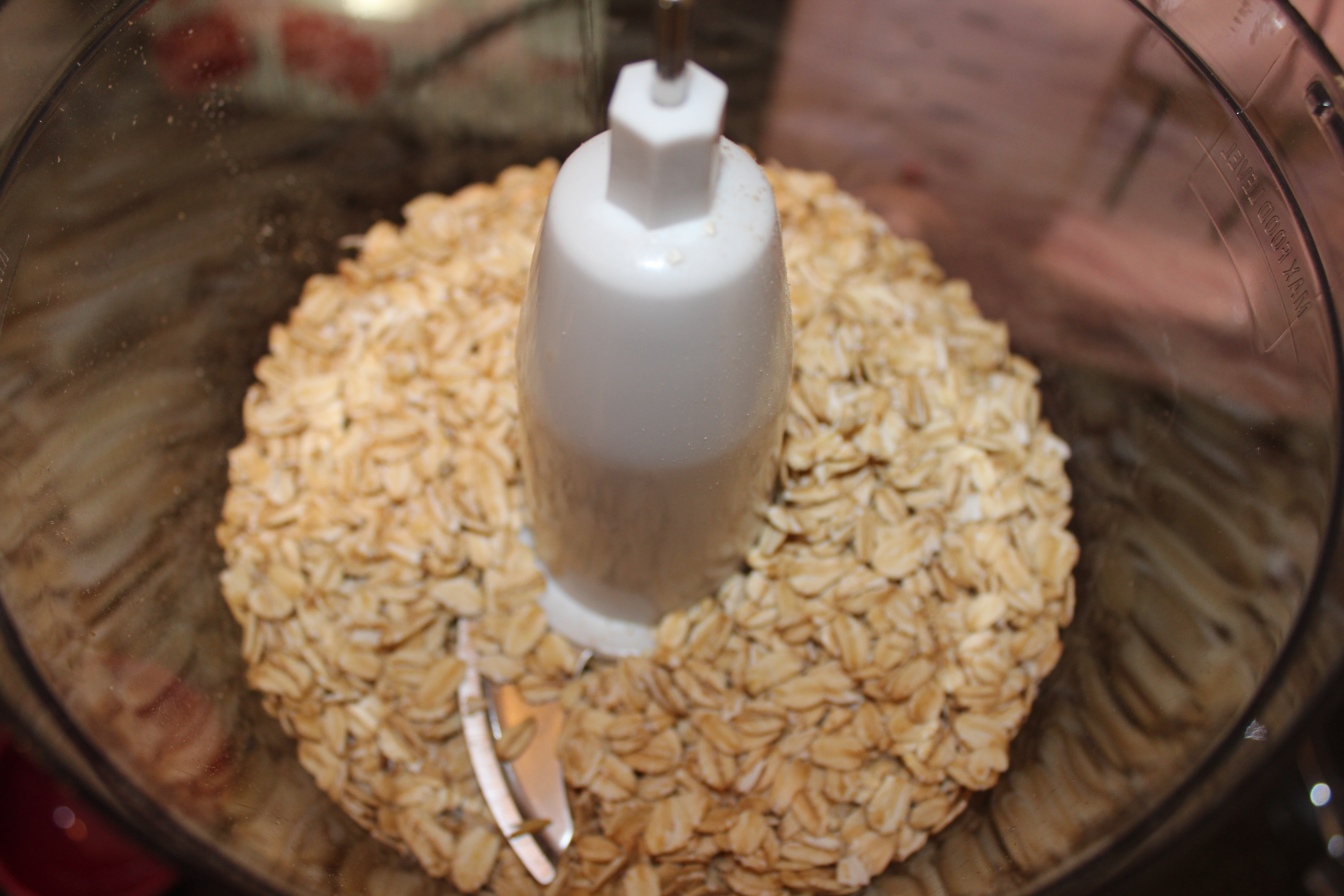 The first thing that I did was take my 1 cup of oats and throw them into a food processor so that the consistency was more like flour. You will deff want to do this, I have made them without doing this and the texture was more like a chewy granola bar. I then took my chocolate chips and blended them as well, this allows you to use less product but still taste them throughout the entire batter. The last time I made these I just put one or two on top and that worked well too. Then I put all of the ingredients into a mixing bowl and just used my hands to mix everything together. This nice thing about this mix is that everything is edible so you can taste the batter as you go a long and tailor it to your own taste.