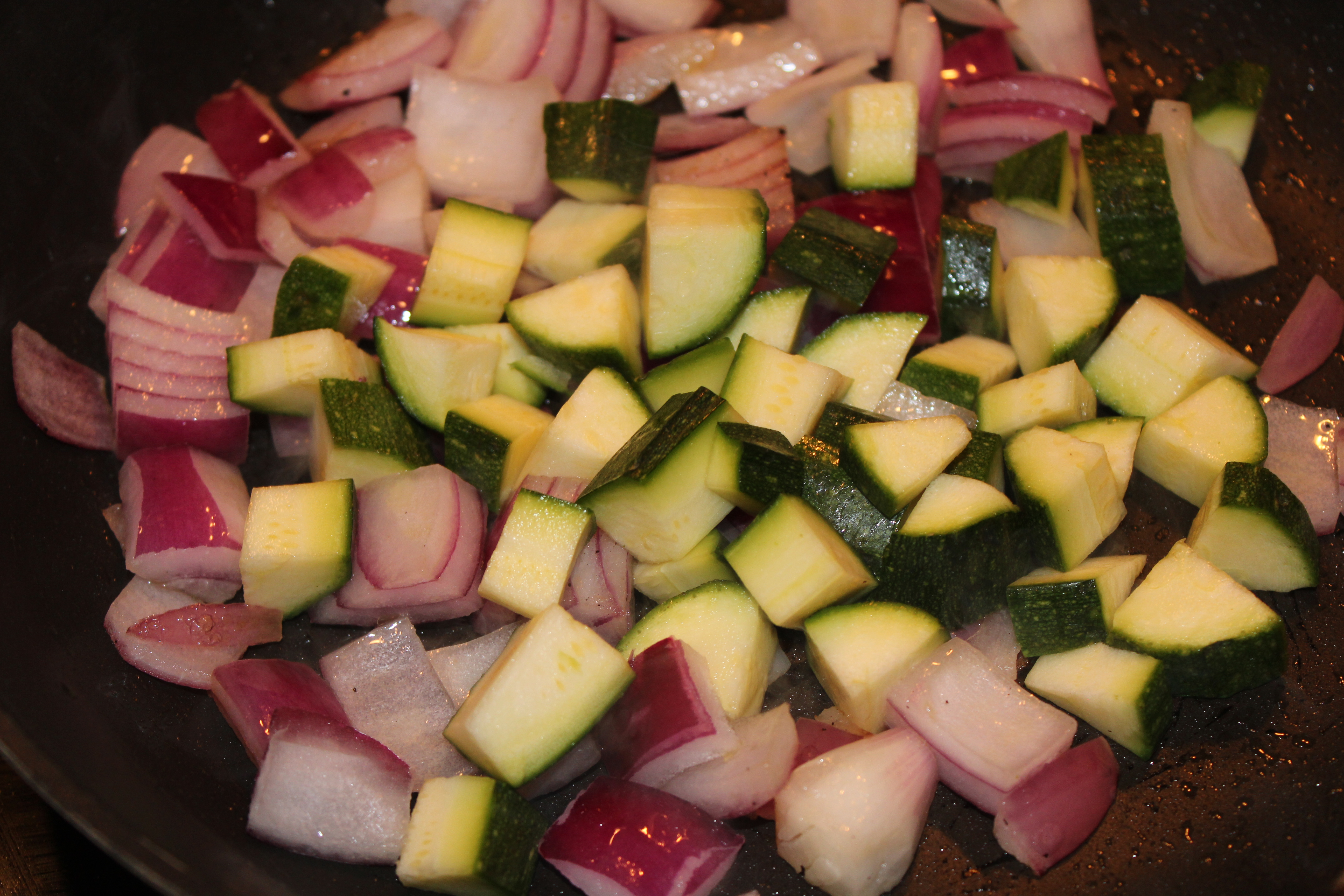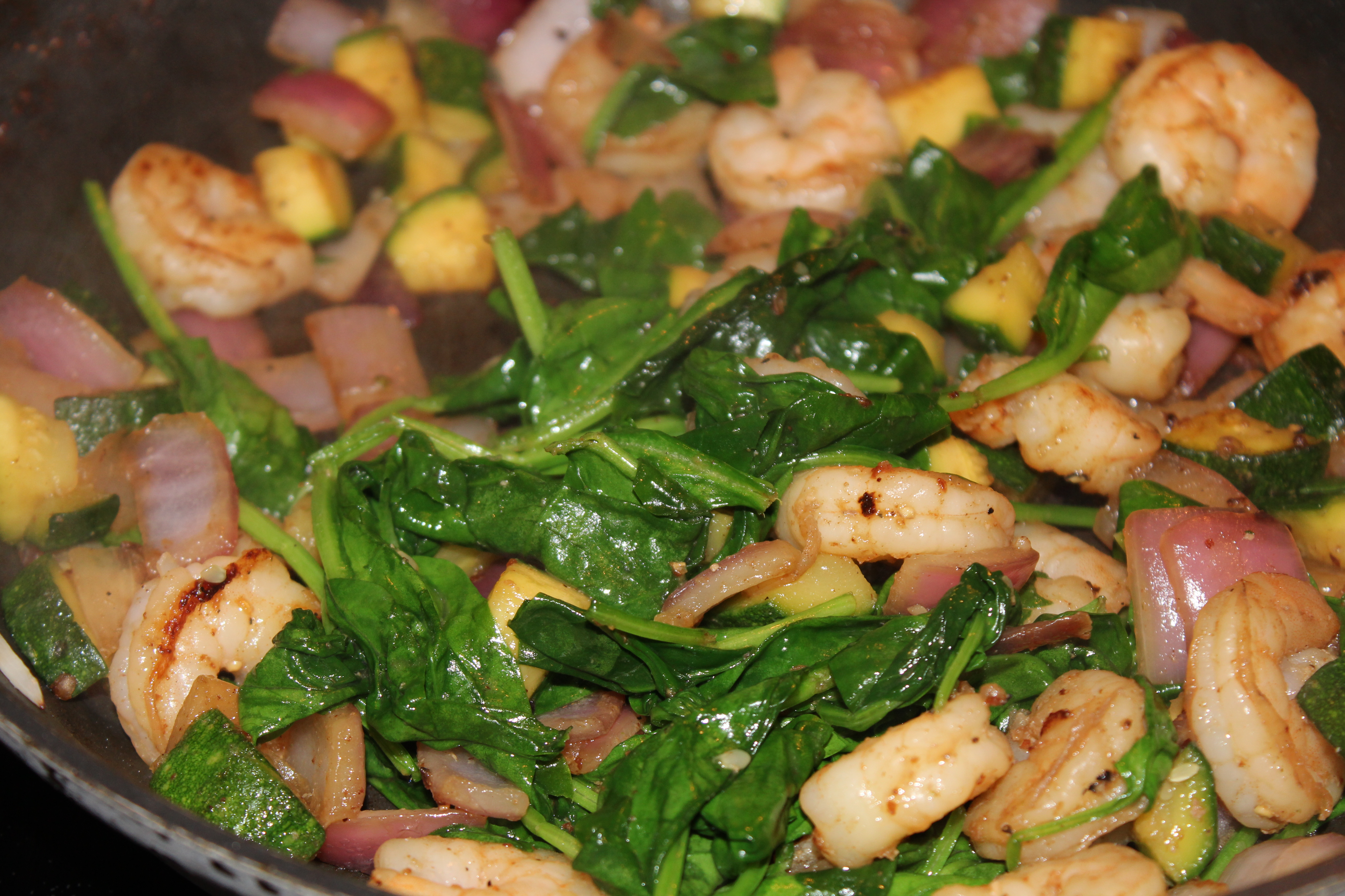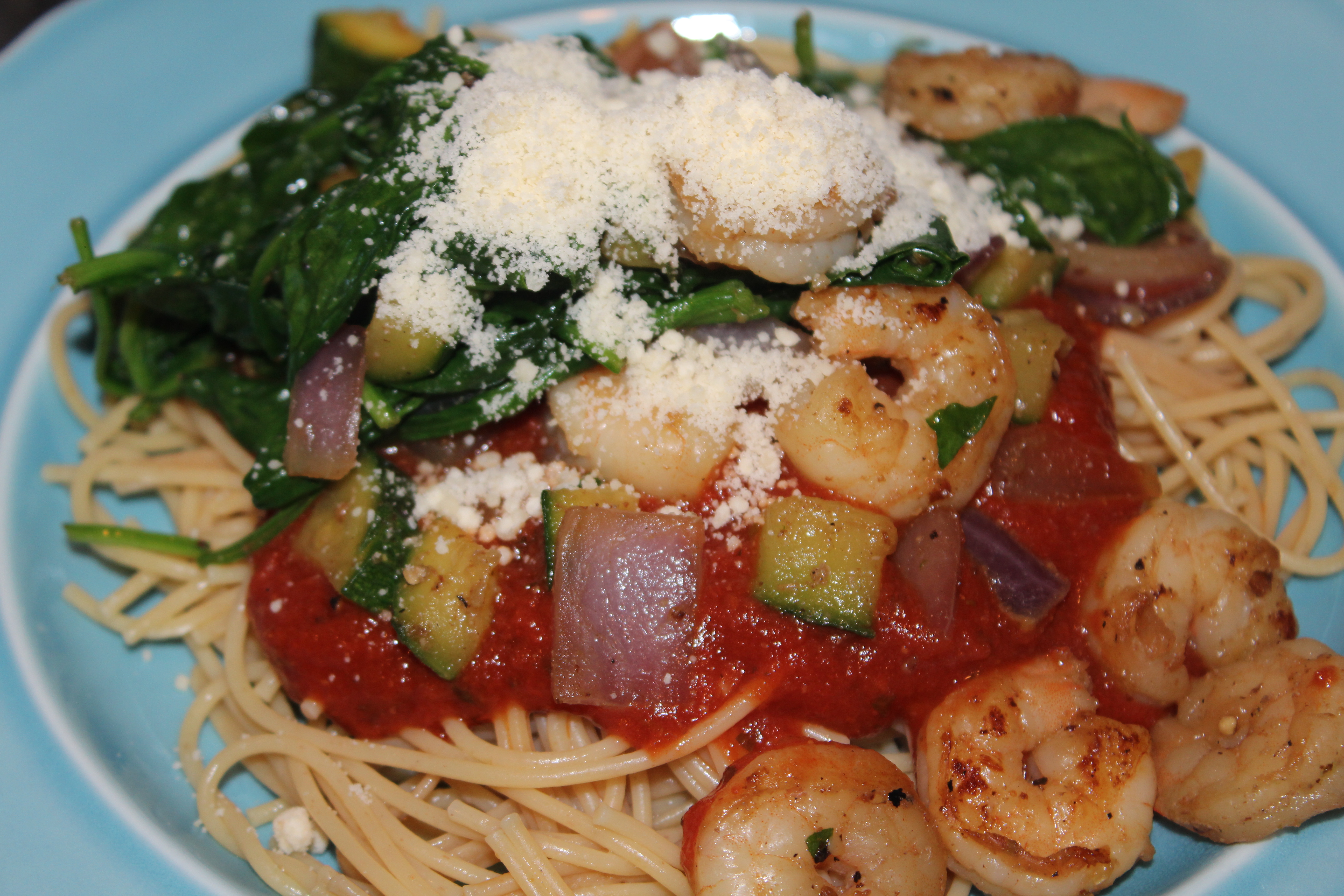 I first pulled out the marina sauce my mom made us from the freezer (thanks mom!) and let it defrost the day before.  Then that night I made a bunch of pasta almost a pound of Pasta Plus spaghetti.  Then I sautéed the veggies, I just use whatever I have in the fridge today it was zucchini, red onion, and baby spinach.  Then I cooked the shrimp and assembled everyone’s dish and topped with Parmigiano a necessity and only has about 20 calories per tablespoon but it adds so much flavor!