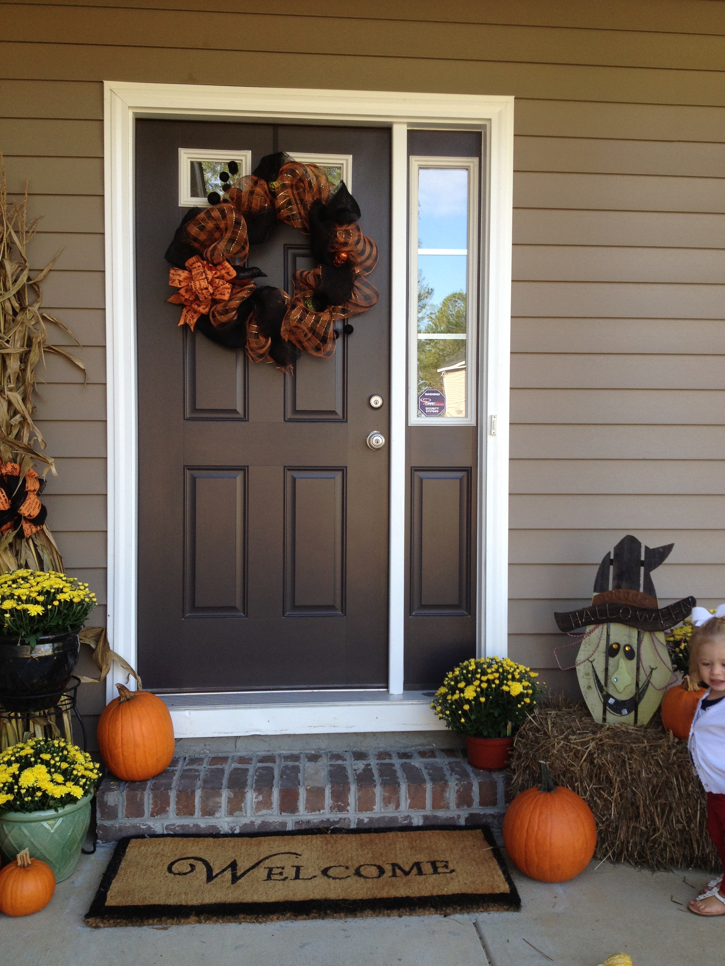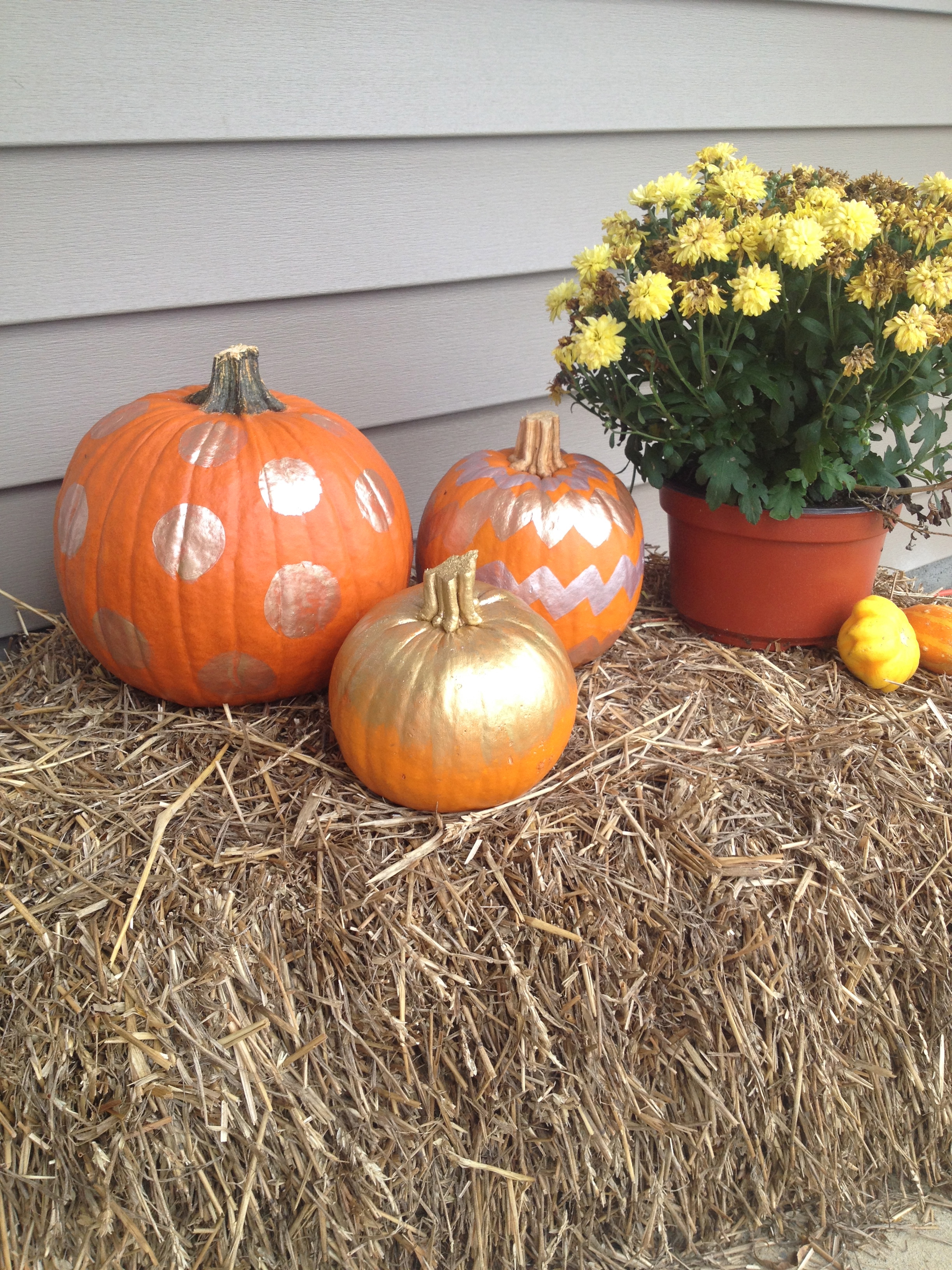 Decorating for fall is so exciting, I love all warm colors and all of the flowers and pumpkins, I just think that it makes a house feel so warm and cozy! This year instead of carving pumpkins we painted them in neutral colors so that we could leave them up until Thanksgiving. This was a super easy craft that is perfect for kids of any age, I chose metallic colors, but you could do a Halloween theme or even black and white would be cute too. I think that they turned out super cute and the babe had so much fun painting them! If only our flowers would have survived it would still look adorable for some reason we tend to kill every plant we buy… so disappointing!