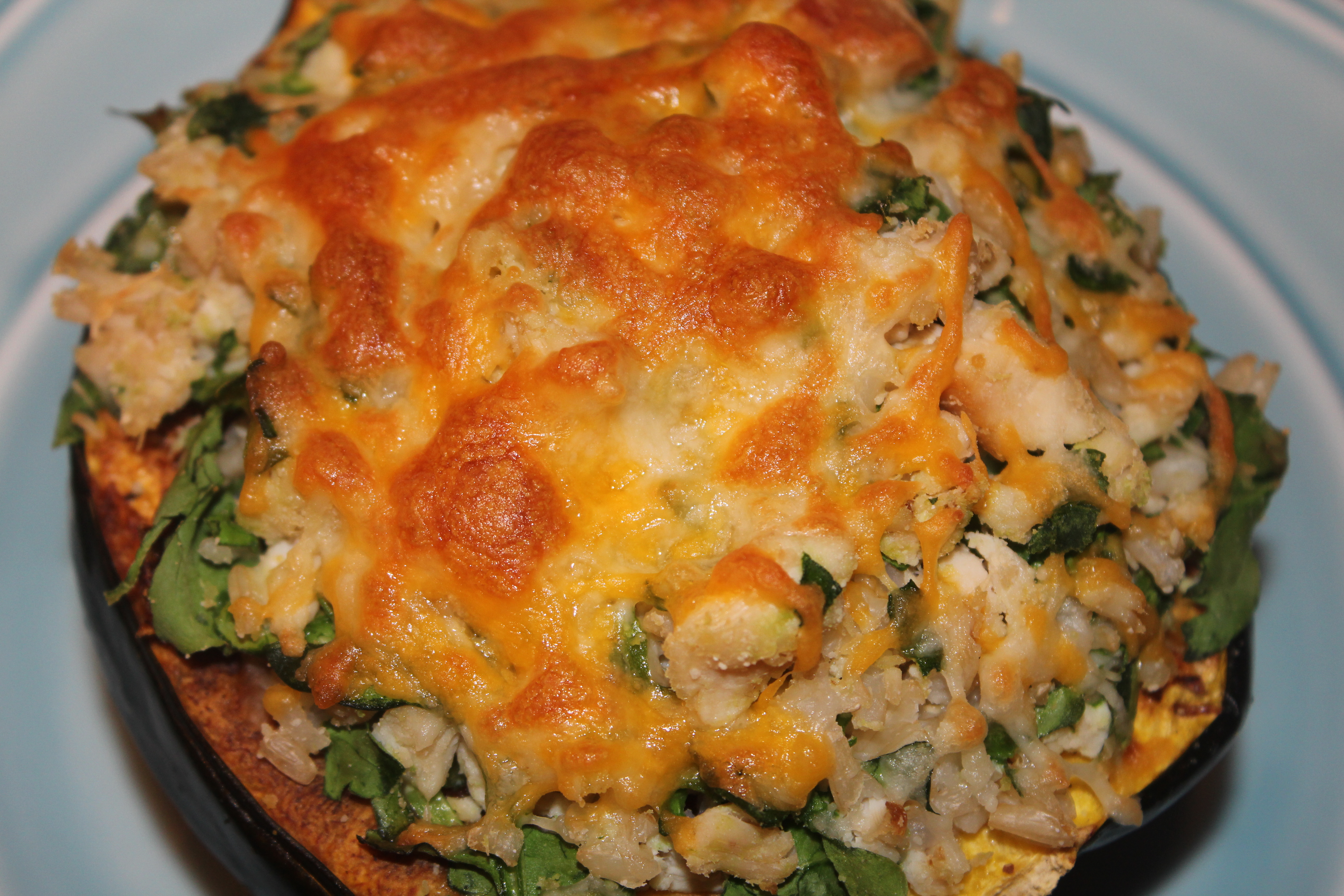 - Fill squash with your chicken or veggie mixture and top with the grated cheese and place back in the oven for about 10 minutes or until the cheese is golden brown