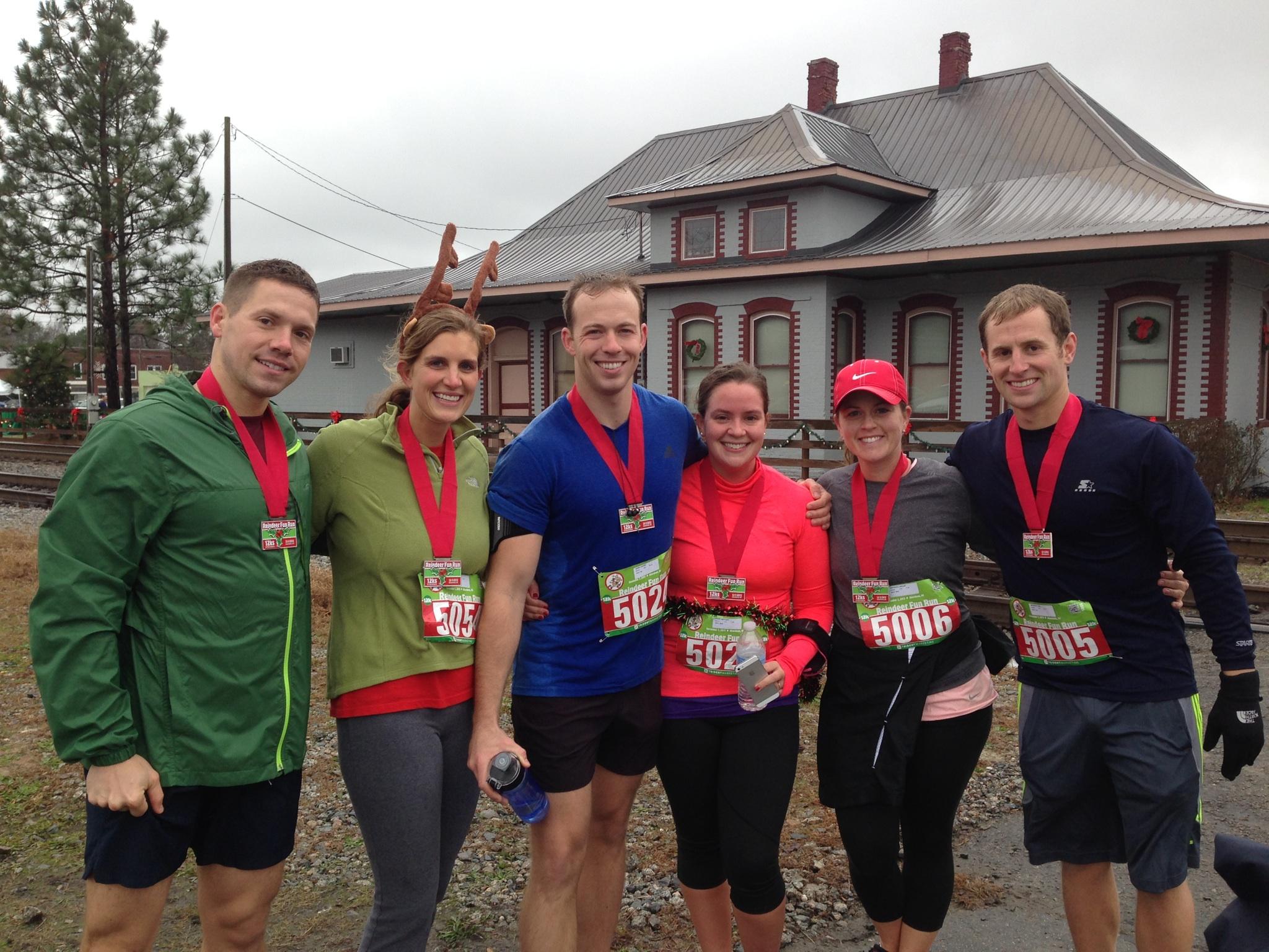 This past weekend we got to run a 12k with our friends down here in NC. The weather has been so nice the past couple of weeks and even got up to 70 degrees on Friday! Of course Saturday the day of our race the temp plummeted and started raining! Overall the race was pretty low-key compared to the Philly Half, but it was a lot of fun besides the constant drizzling of rain! The course was about 7.5 miles long and surprisingly pretty hilly. I didn’t mind the hills because it was a shorter race and it was fun to run around a new area.