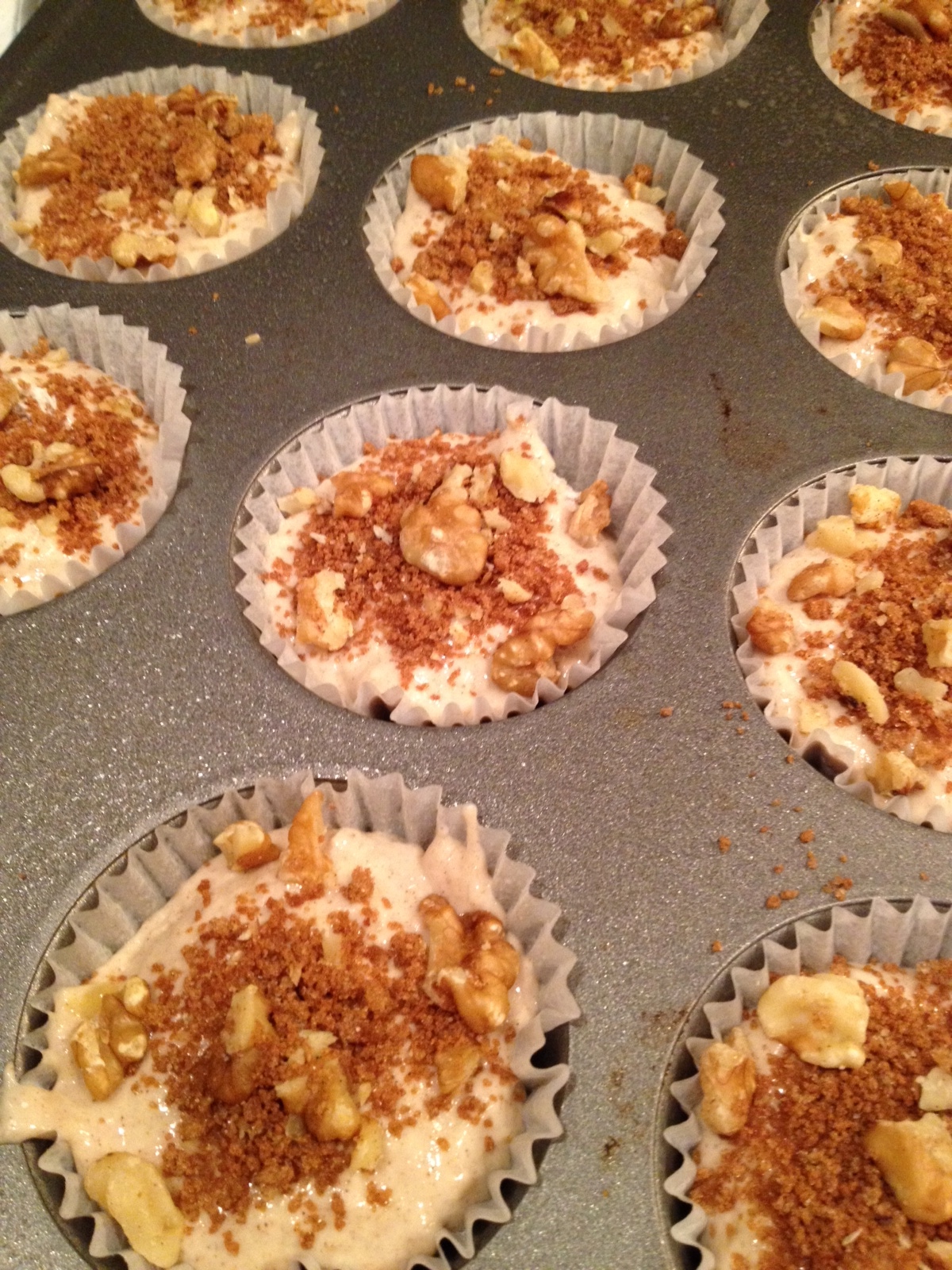 *Preheat oven to 325 degrees F, in a small bowl mix together the almond milk and vinegar and let sit for a couple of minutes until you start to see the texture change. Next Combine all dry ingredients in a large mixing bowl. Mash up the bananas and then combine all of the wet ingredients and stir well. Next step is to combine all of the wet with the dry and stir until well combined. Scoop into a bread loaf pan or muffin tins and then start your crumb topping. In a small bowl combine your cinnamon, brown sugar, and crushed walnuts. Stir mixture together and top each muffin with desired amount. Pop them into the oven for about 20 minutes or until a toothpick comes out clean.