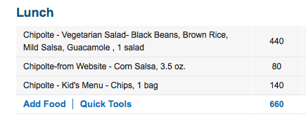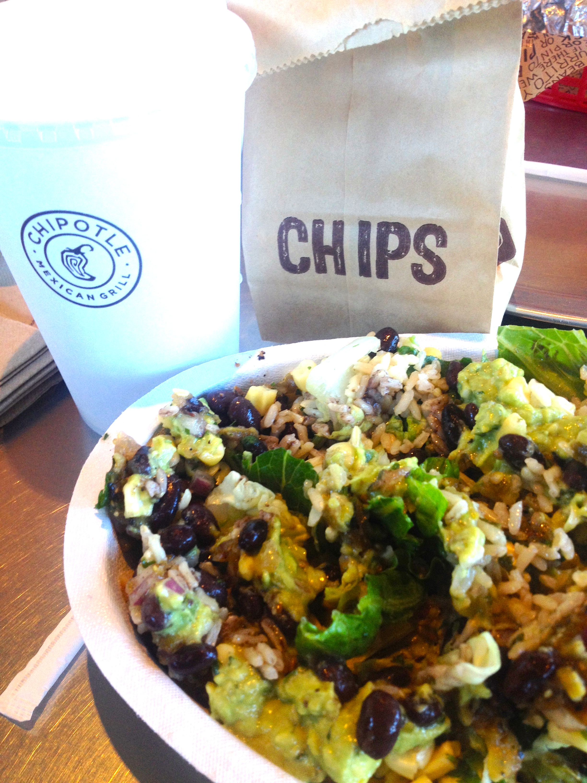 For my salad I had brown rice, black beans, lettuce, corn salsa, guacamole, and instead of the dressing two spoonfuls of medium salsa. Ā I ate the entire thing because I was starving and had chips it was so good and yes it still had a lot of calories at 660 but you could maybe eat half of the salad or skip the chips all together.