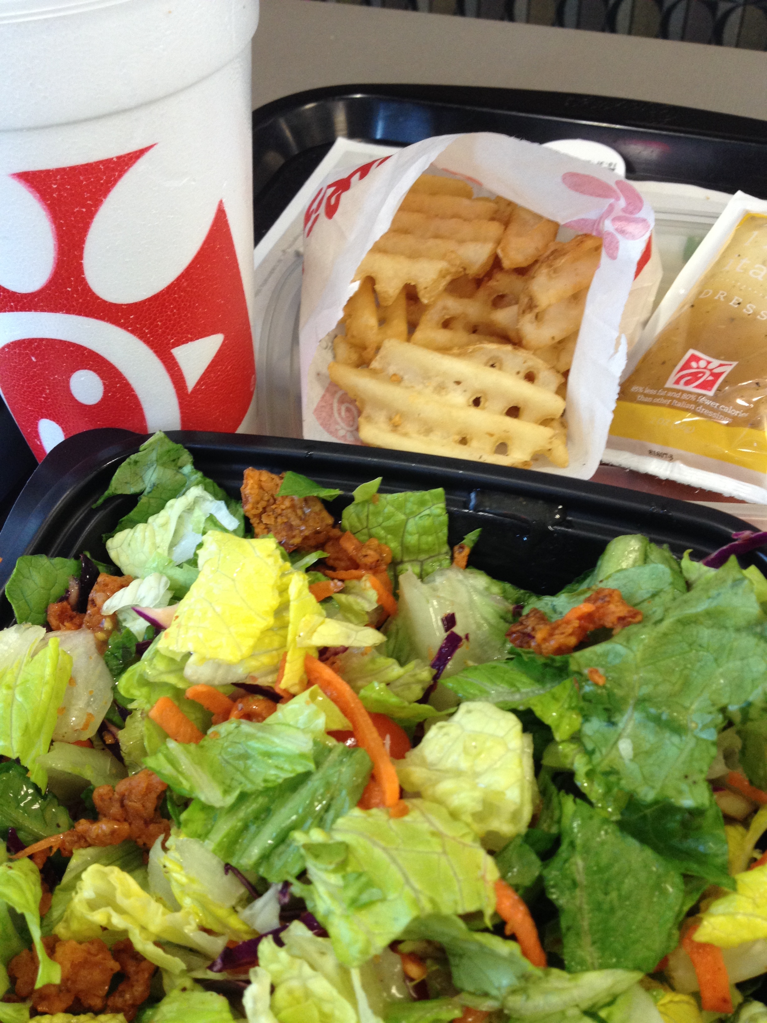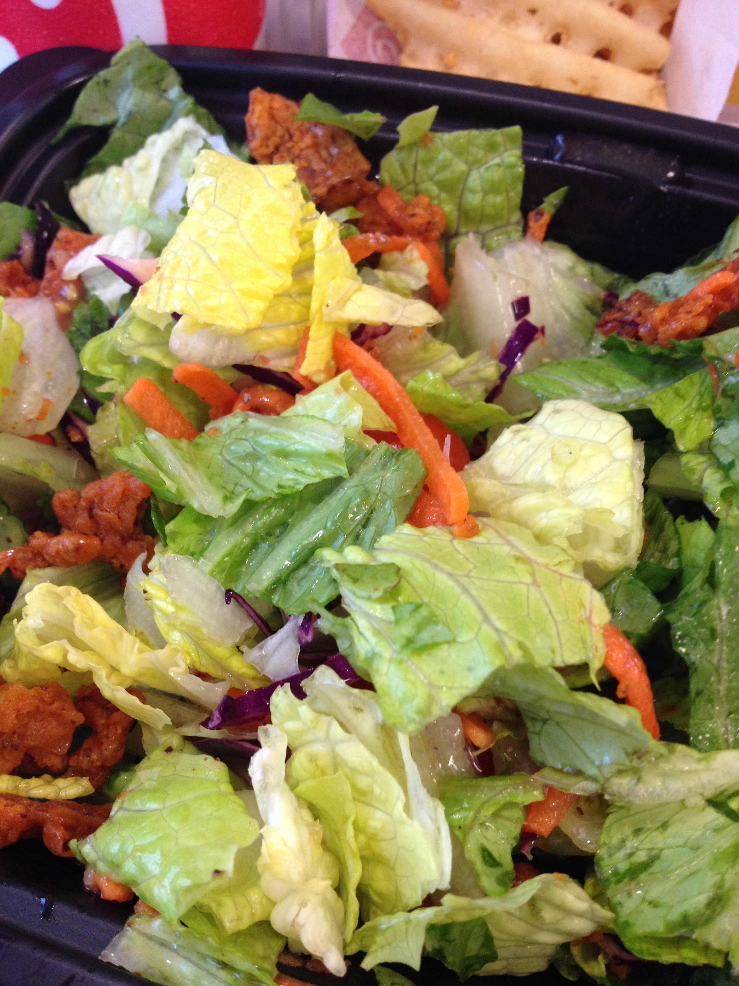 So this meal was just under 400 calories and it hit the spot! Ā I had a medium diet lemonade, shared small fries, and had a side salad. Ā I just asked the employee if it was possible to get the salad without cheese and she said it was no problem! Ā I previously checked to make sure that the fires and salad dressing were vegan so the only thing I had to change from what I normally order was the cheese.
