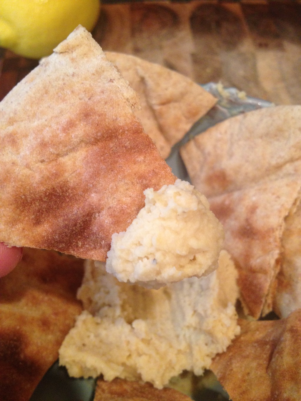 For the pita chips I took a pita bread that I had in the fridge and broiled it in the oven for a few minutes until it became crispy. I love this brand because it only has 60 calories for an entire pita compared to 130 calories for about 10 pita chips you would buy at the store in a bag. I then just cut it into triangles and they were perfect to dip into the hummus. If you wanted to add extra flavor you could brush the bread with olive oil before you put it in the oven.