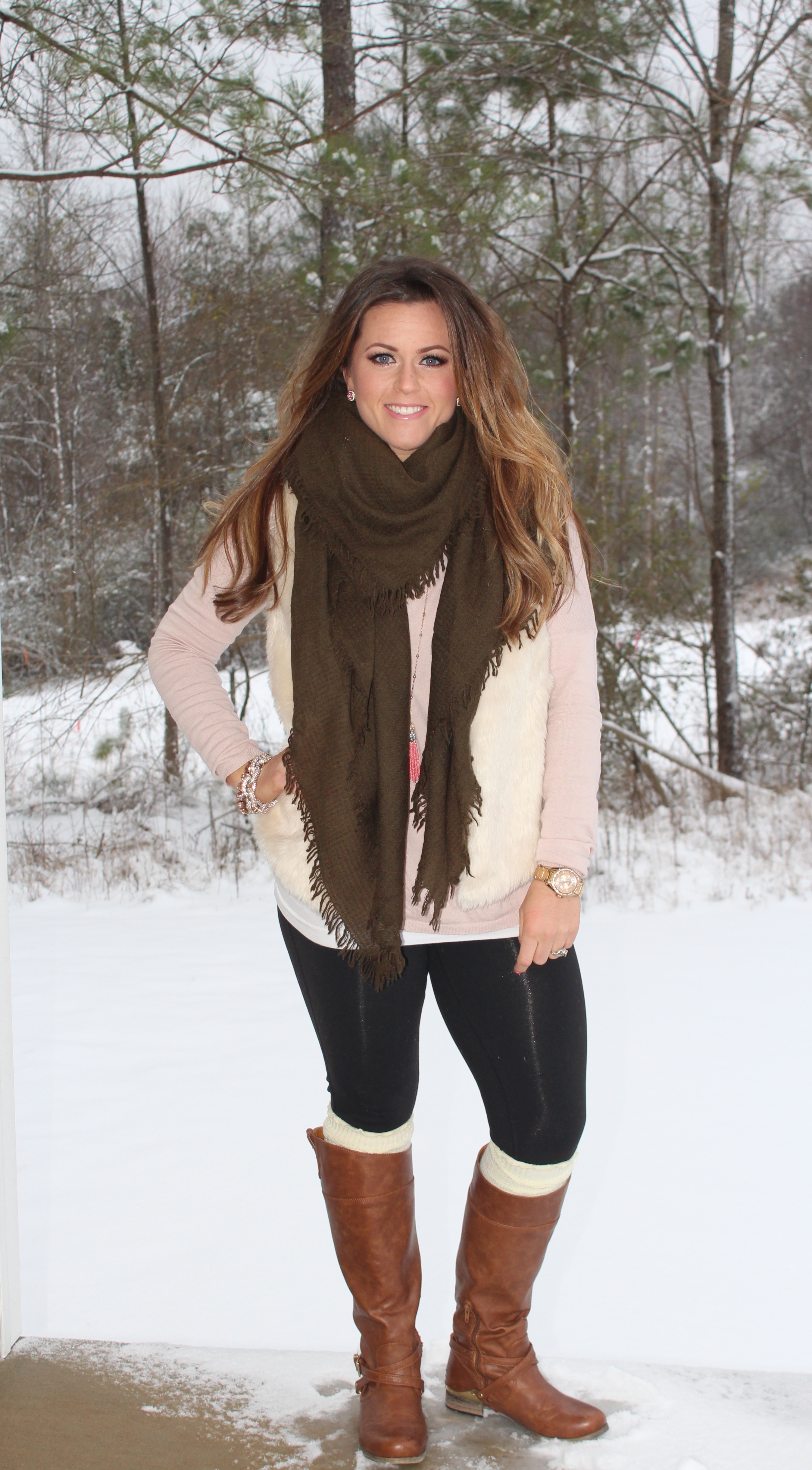 Scarf- Zara, Sweater- Zara, Faux Fur Vest- Local Boutique, Bag- J.Crew, Boots- Aldo, Socks- Madden Girl, Leggings- Target, Link Bracelet -Ily Couture, Necklace- T.J.Maxx, Pink Bracelet- H&M (old) Watch- Fossil