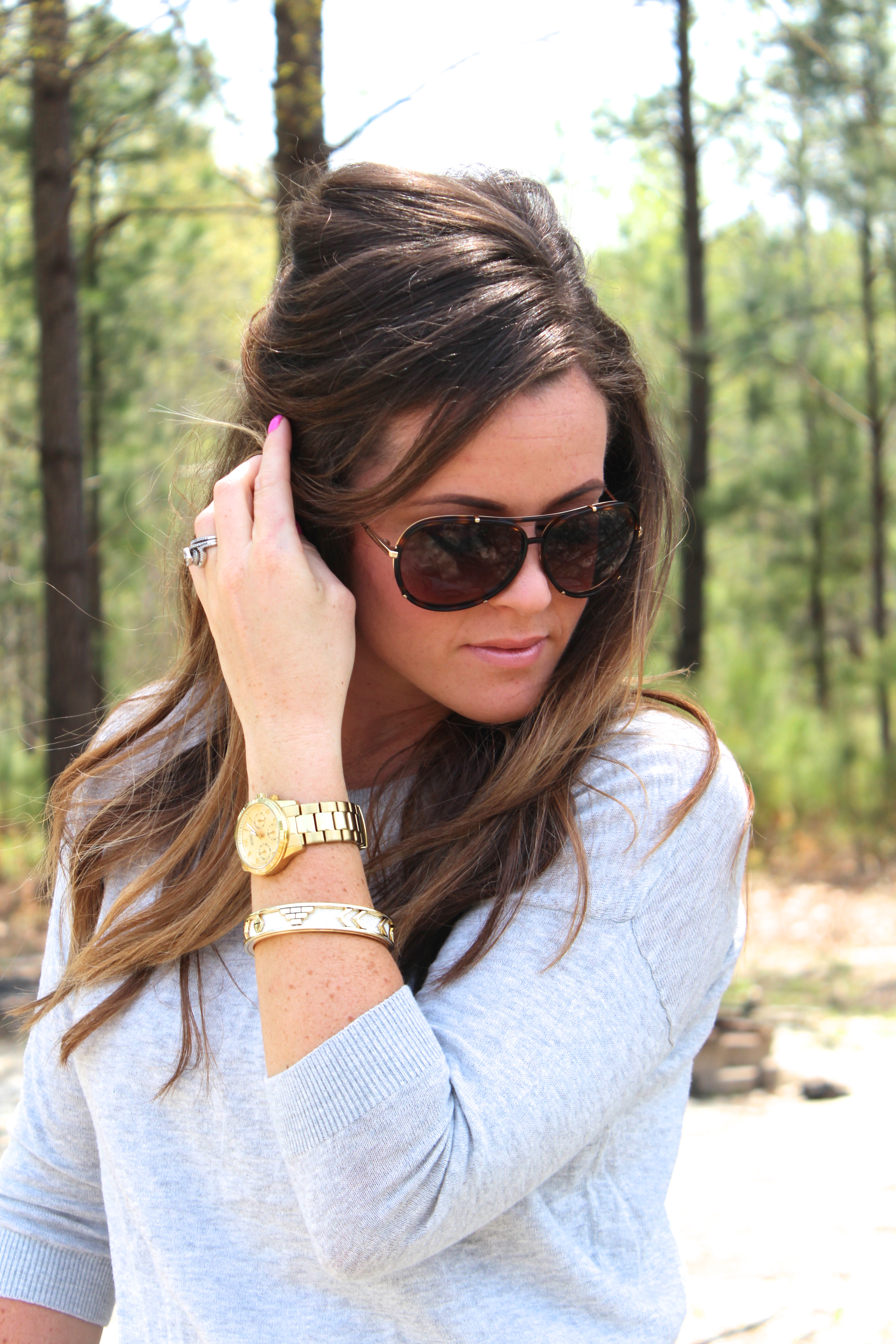 My sunnies are Jimmy Choo and I love that they are still a classic aviator shape but still unique because they are oversized and made from a tortious print. Watch is by guess and I love this bracelet from my sisters that they found at Nordstrom made by House of Harlow!