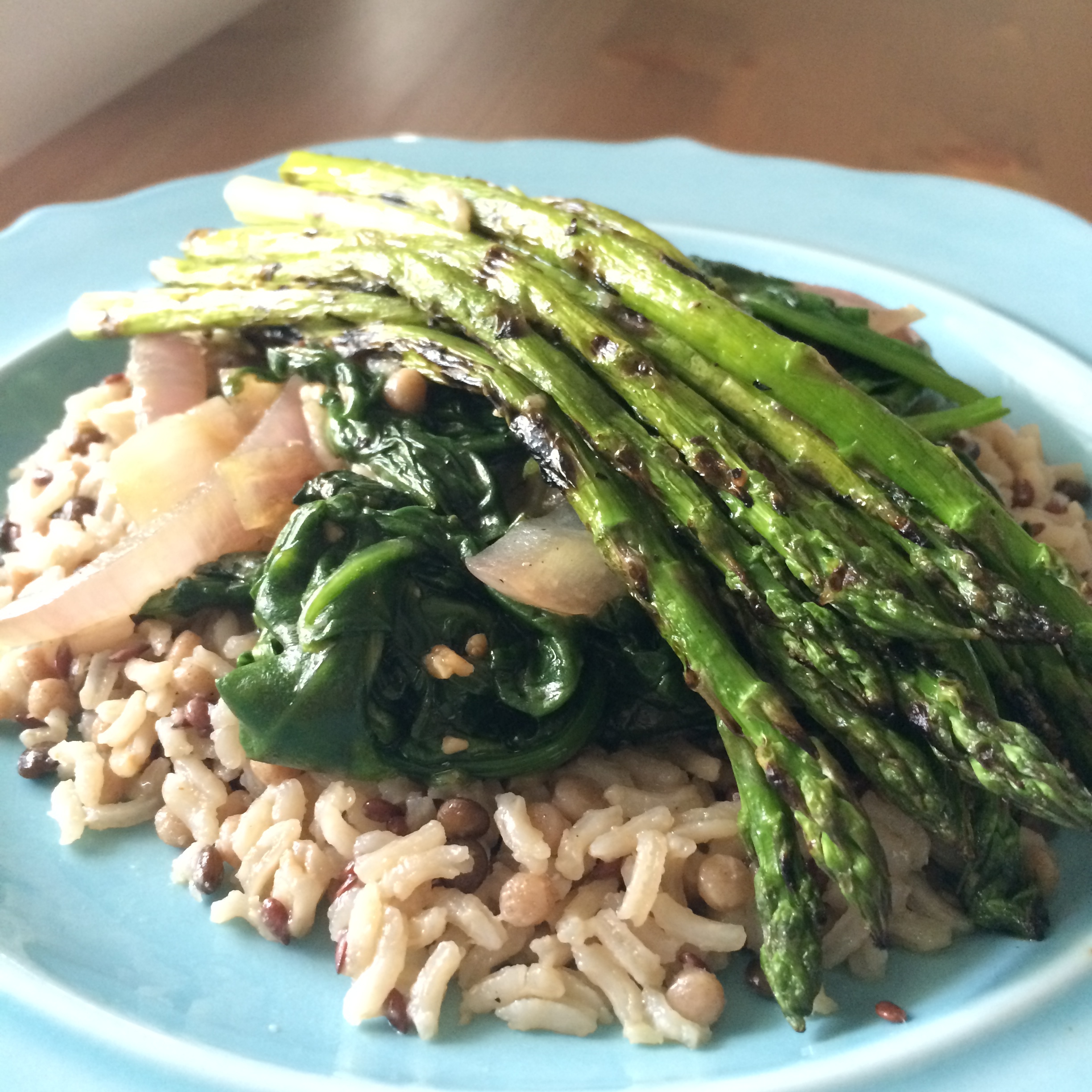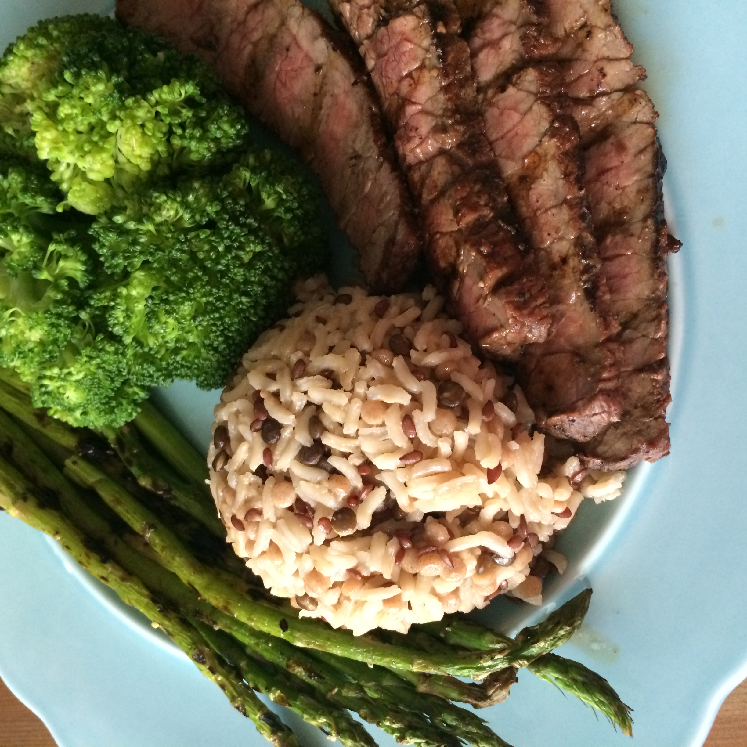 Pictured above I chose to serve it plain with sautéed spinach and grilled asparagus for me, and below for the hubs and my daughter with steamed broccoli and a grilled London-broil marinated in Italian dressing by Good Seasons.