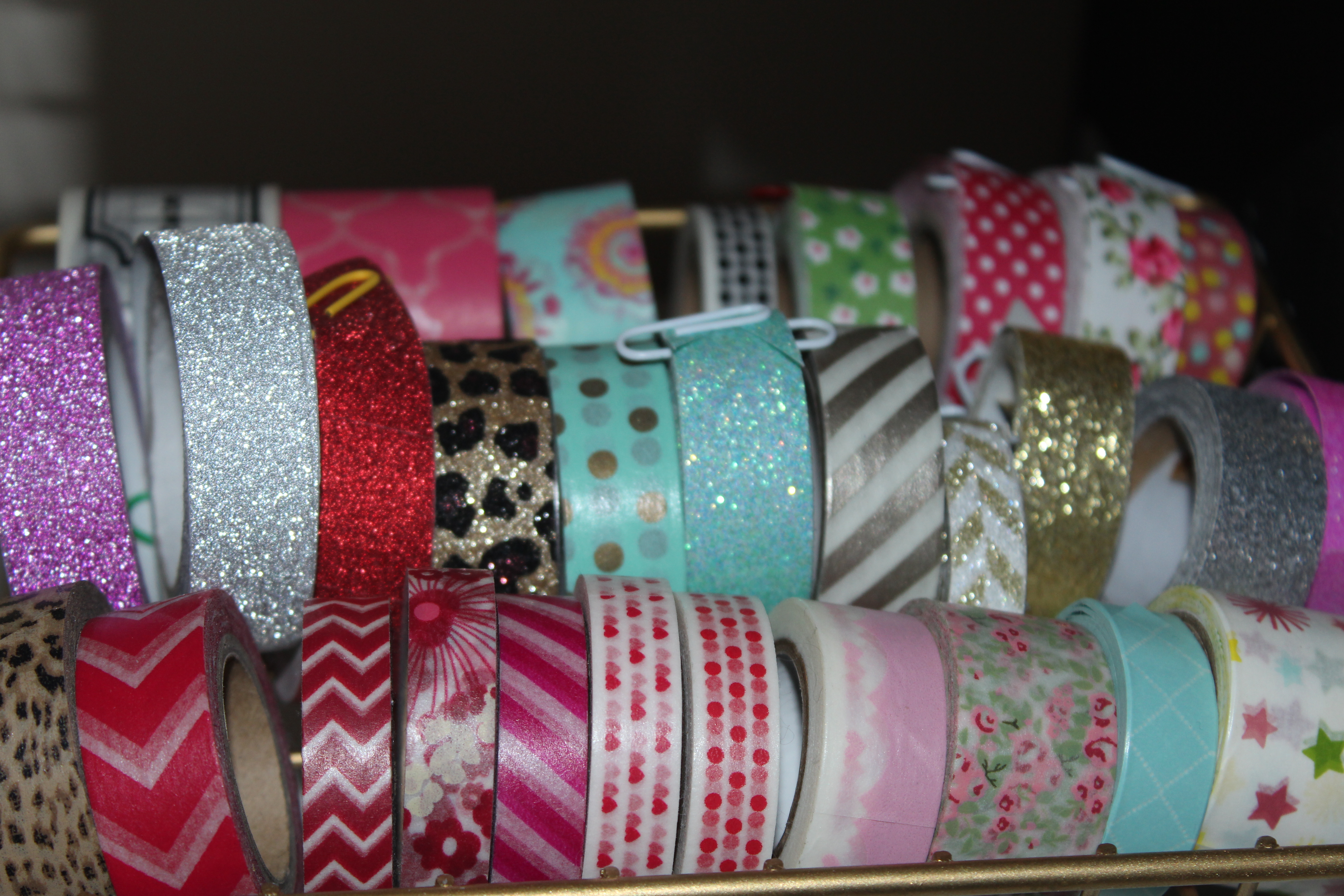 I have recently accumulated a bunch of these cute wash tapes that I find myself reaching for now that I have them neatly stored in a three-tiered metal rack that I actually found at Wal-Mart in the bath section. I just spray painted it gold and it works perfectly for post-its and other office related goodies!
