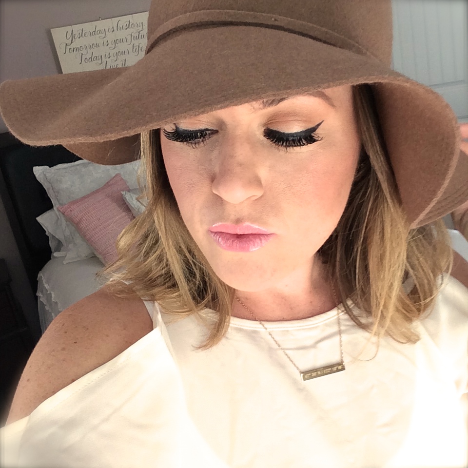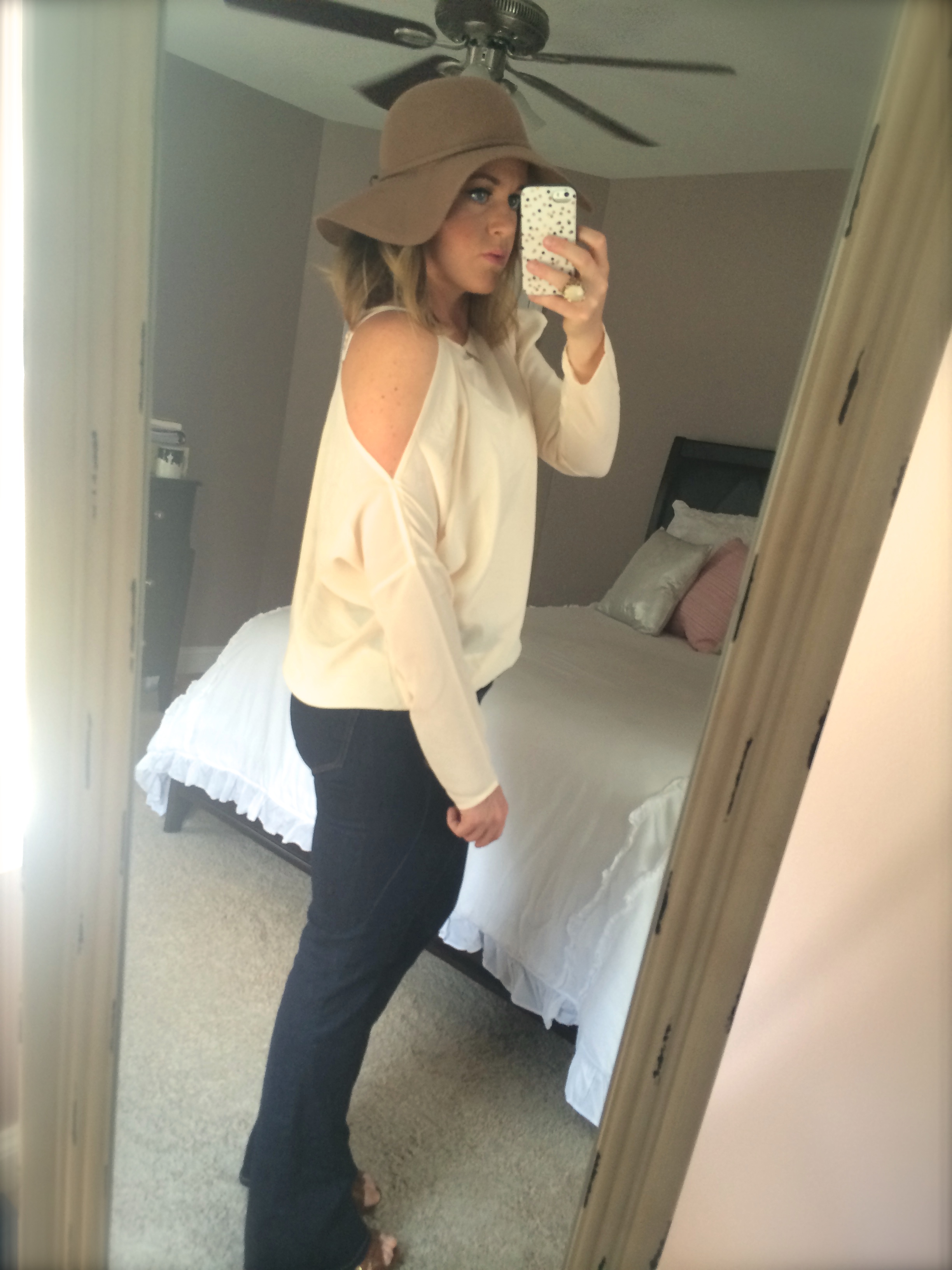 The Faith Top (Fevrie)| Floppy Hat| Boot Cut Jeans| Lat & Lo Necklace| Tory Burch Large Logo Studs| Brown Strappy Wedge| Phone Case|